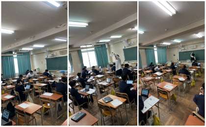 各学級を3グループに分けて6限に実施しました。1グループあたり15分程度の時間を予定していましたが、タブレットとヘッドセットを利用しての調査ということもあり時間内に終了することは難しかったようです。