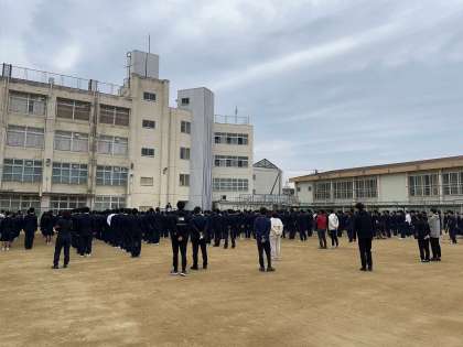 今年度から、太陽に背を向けて、できるだけ集会に集中できるようにと、集会の整列を変更しています。