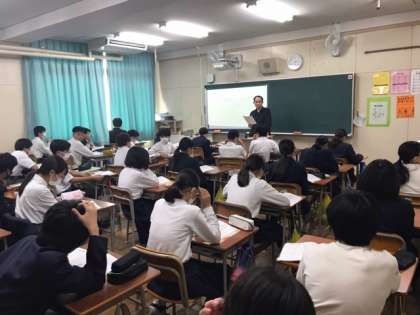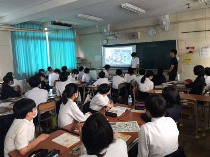 22日(月)の5、6限に2年生はいじめについて学びました。図の中から問題のある行動を見つけて、グループで話し合って発表しました。