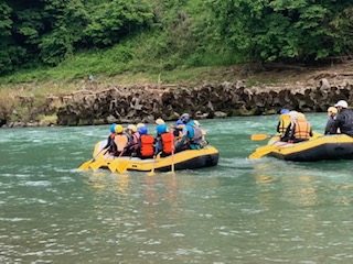?14:00ごろ、リバーベースさざなみに到着し、いよいよラフティングです。ウェットスーツに着替えて、安全講習を受けたあと、ボートに乗り込みます。心配されていた天気も徐々に晴れ始め、寒さも随分和らぎました。ただ、水は凍りそうなぐらい冷たいです。