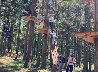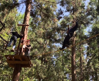 お世話になったペンションの方々に別れを告げ、?午後からは選択別体験に向かいます。ペンションから一番近くにあるのはコルチナアドベンチャー。自然にある木を使ったアスレチックに挑戦です。最初は怖がっていた人も進むにつれてスムーズに動けるようになりました。