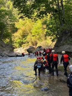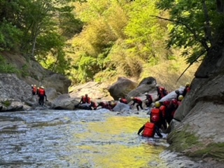 自然の川を満喫することができるキャニオニング。水がかなり冷たいことは心配ですが、力を合わせてコースを下りきったときの達成感は格別です。みんな、頑張って!