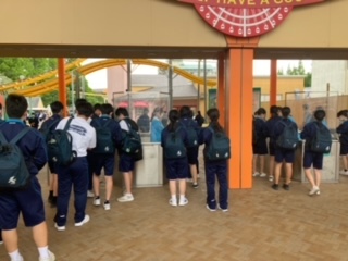?ナガスパに到着後、学級写真を撮って、いよいよ入場です。ホテル出発時は日が差していましたが、こちらの空はどんよりしていて、小雨も……。