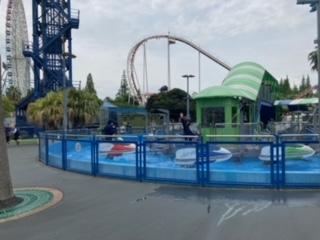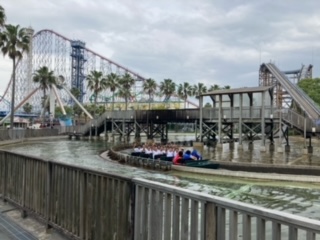 ?友だちと楽しくまわります。動き始めてすぐに急流すべりでびしょ濡れになっているグループを発見!