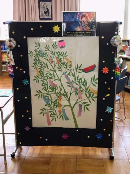 図書室では、6月16日(金)〜7月7日(金)の間、七夕フェアとして「星降る図書室」を開催します。この期間に図書室を訪れると、短冊がもらえます。その短冊に図書室に入れてほしい本のタイトルを書いてボードに貼ると、願いが叶います。一人何枚でもかまいませんので、この機会に図書室を訪れて短冊に願いを込めてみてください。