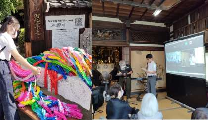 東住吉中学校では、平和への願いと模擬原爆で亡くなられた方々への追悼の意を込めて、全校生徒で千羽鶴をつくりました。その千羽鶴を生徒会執行部の代表生徒が恩楽寺に献納しました。