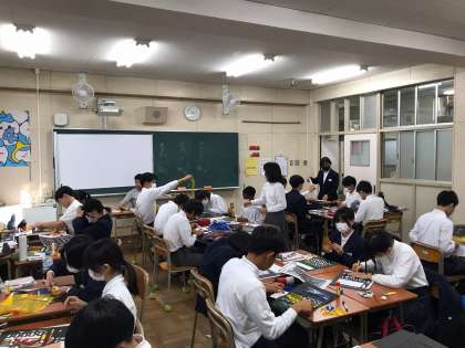 16日(月)の5、6限に、2年生はステンドグラスの制作に取り組み、実行委員から「セロファンの貼り方」について説明がありました。説明を受けて、下絵を切り終わった人は、9色あるセロファンを切って貼りました。