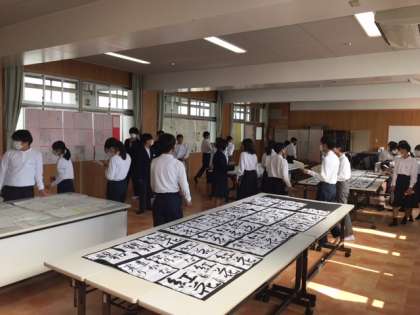 1.2年生の展示見学が始まっています。今年は4年ぶりに班で行動しています。3年生は昼食中です。