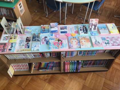 学校図書館では、2月9日(金)から恋愛特集を開催しています。上の画像の本は図書委員のおすすめです。飾りは図書館ボランティアの方がセットしてくれました。