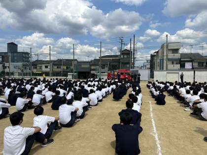 本日、6限目に火災に対する避難訓練をおこないました。東住吉消防署から消防士さんに来ていただき、消火器の使い方を教えていただき、実際に消火器(水)訓練をおこないました。