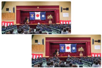学校長より式辞が読み上げられ、来賓紹介がおこなわれました。続いて、在校生代表生徒より新入生に向けて「歓迎の言葉」が読み上げられました。困った時や悩んだ時は、先輩たちに話しかけてほしいです。