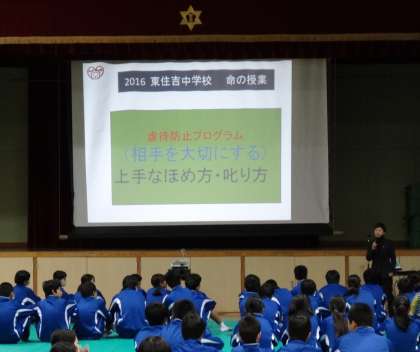 前半は地域のお母さんから子どもが生まれた時のことや子育てをしていて大変なこと、嬉しいことなどのお話をグループに分かれて聞きました。後半は徳谷先生から上手な褒め方・叱り方についてのお話を聞きました。ペアになって友達の良いところをお互いに褒め合いました。褒め合っていると自然と笑顔になり、楽しい雰囲気の中で授業を受けることができました。その他にも、イライラした時にどうやって気持ちを落ち着かせるのかなど、感情のコントロールの仕方やコミュニケーションの上手な取り方を身体を動かしながら楽しく学ぶことができました。
