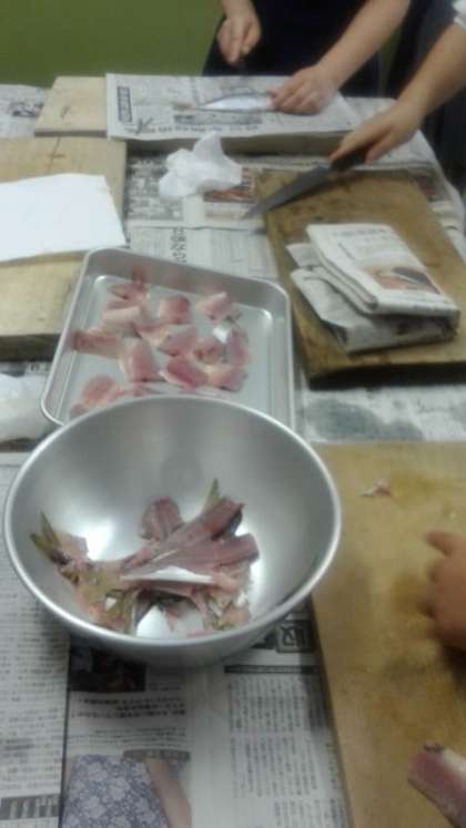 修学旅行3日目 ほんなもん体験2日目       アジフライ定食、途中経過。