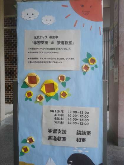 昨年に引き続き、元気アップでは1日(月)、3日(水)、4日(木)、5日(金)の4日間で「学習支援&茶道教室」を実施しています。