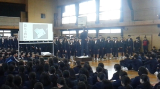 7日(火)の1限にお別れ式を行いました。在校生に拍手で迎えられ、卒業生が入場してきました。