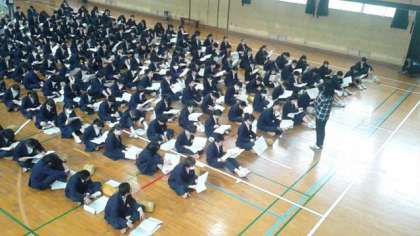 20日(木)の6限に修学旅行に向けて、集会を行いました。まず、パワーポイントを用いて、職員が下見のときに撮った画像を見せながら3日間の流れを説明しました。次に、プリントを用いて、詳しく説明しました。