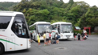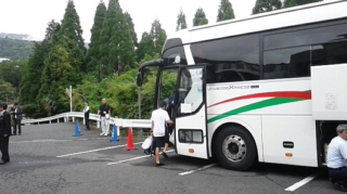 部屋をきれいに片付けて、華の荘に向けて出発しました。ラフティング体験をするので、水着とTシャツに着替えました。