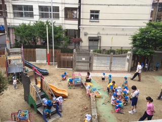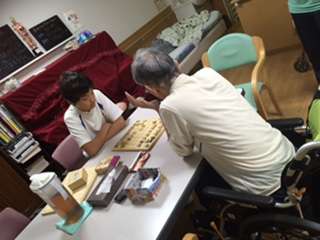 保育園の園庭で外遊びをしているところと、デイサービスで利用者さんと将棋を指しているところです。