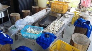 Aコース、一軒目に到着しました!とても広い敷地があり、到着したときは、家の裏でホタルやカブトムシの生態についてお話してくださっているところでした。庭には、缶取りゲームをするスペースがあり、夜に石の上に立って北を見ると、北極星が見えるそうです。また、昨晩は潮干狩りに連れて行ってくださったそうです。
