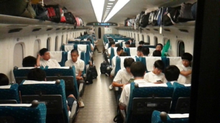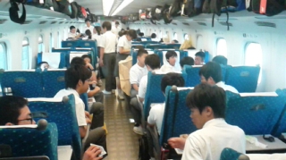 帰りの新幹線車内です。行きに比べると、疲れて寝ている人も多いですが、最後のお菓子タイムを楽しんだり、カードゲームをしてたりする人もたくさんいます。