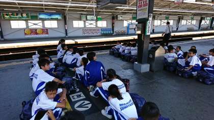 朝のラッシュの中、学校で練習した隊形に素早く動いて整列。