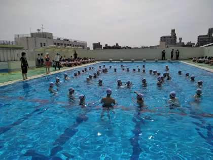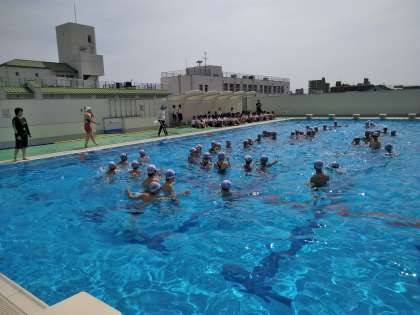 天候にも恵まれ、最高のプール日和の中、準備体操をして入水します。さて、どのような動きに挑戦するのでしょう。