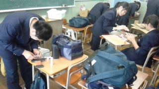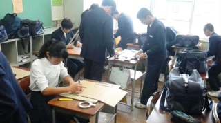 今回紹介するチームは「大道具・小道具」です。このチームは音響と照明も兼ねています。劇で必要になってくるほとんどの道具をこのチームが作ってくれています。教室では、剣をたくさん作っていました。また、体育館では、初めて音響と照明も行いました。