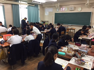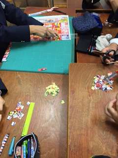 2年生のモザイク画作成は、チラシを切ったり色分けしたものを貼り付けたり、それぞれの班ごとに取り組みを進めています。