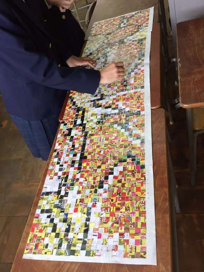モザイク画作成も大詰めを迎えています。シートに貼る作業が一段落した班は、それぞれをつなぎ合わせ始めました。絵になるのか不安になっている人も多いようですが、この写真を見ると……。