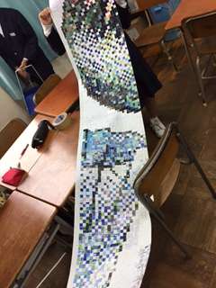 何の絵かわからず、絵ができるかも不安になりながら進めてきたモザイク画ですが、つなぎ合わせると少し絵が見えてきました。とはいえ、まだシートに貼り付けている人もいます。一方で文化委員が集まって別の作業をしてくれています。あと3日、最後までしっかり頑張りましょう。
