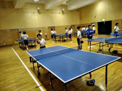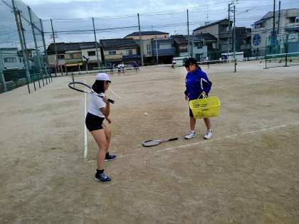 卓球部の体験ではラケットを握り、中学生の先輩とラリーをしています。ソフトテニス部の体験では、打ち方を教えてもらい、上手くネットを越えてボールを打つことができています。