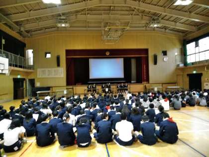 スライドと映像を用いて、中学校の行事や部活動の様子、学校のルール等を伝えました。