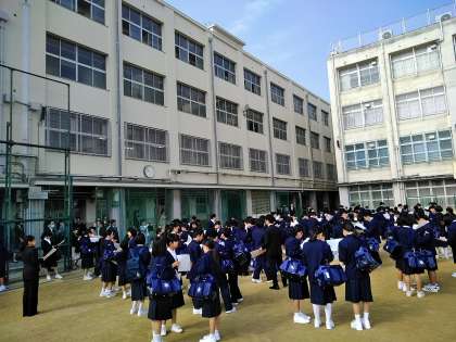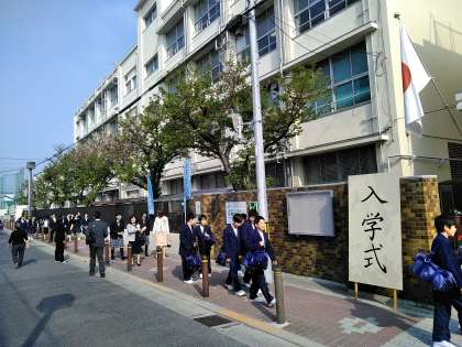 新入生、ご入学おめでとうございます。4日(水)、入学式を行いました。今年の正門の桜は葉桜になりましたが、新入生は元気に続々と登校してきてくれ、正門で写真を撮ったり、新しいクラスの名簿を見たりしていました。そして、職員に「おはようございます」「おめでとうございます」と声をかけられて、新しい教室に向かい、その後、運動場に整列しました。