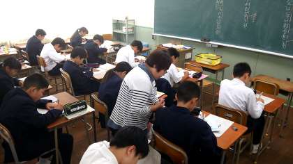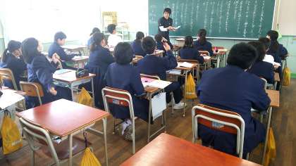 1年生の国語科授業のようすです。本日は文法の学習をしました。1つのクラスを2つのグループに分け、少人数形式で授業を行っているところです。