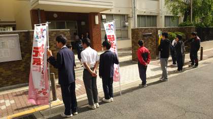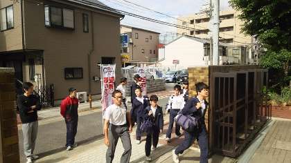 生徒会役員が、「こころの再生」運動ののぼりを持って、朝のあいさつ運動をしているところです。正門前には、「おはようございます」という元気な声が響いていました。