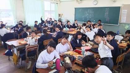 1年生の昼食時のようすです。男女合同の班をつくり、楽しく、美味しく、昼食をいただいています。