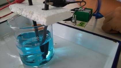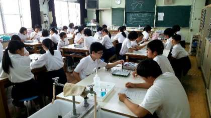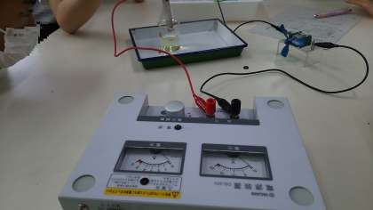 3年生の理科授業のようすです。電流の流れる水溶液や流れない水溶液を用いて、電極をつかって電圧をかけたときの水溶液内での変化を調べる実験をしているところです。