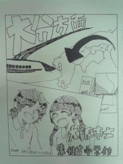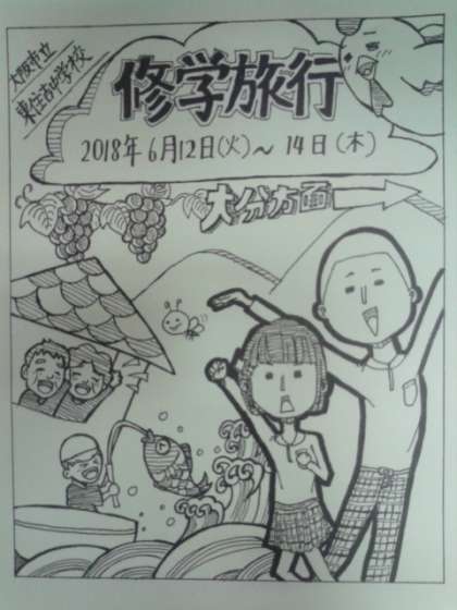 25日(金)に修学旅行のしおりが完成しました。生徒が書いてくれた絵も載っています。本日持ち帰りますので、ぜひご覧ください。左の画像が表紙で、右が裏表紙です。