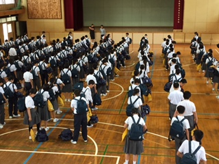 29日(火)の3〜4限に体育館で一泊移住の前日指導を行いました。今日は持ち物の確認と、明日からの心構えについて話をしました。最後に各クラスに分かれて担任から話をしたあと、解散しました。いよいよ明日、出発です。今日は夜ふかしせず、明日に向けて体調を調えておいてくださいね。