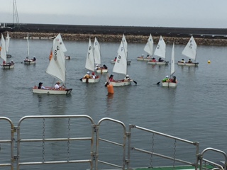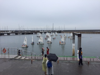 第三班が始まりました。OPヨットは2人1組で、前がスピード、後ろがハンドルの役割をします。風が足りないときにはオールを使って進めます。3か所の目印をうまく回れるように頑張っています。