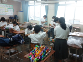 来週の修学旅行に向けて、先月からルール作りや新聞作りなど、積極的に取り組んでくれている修学旅行実行委員ですが、6日(水)の放課後は、先日の平和学習で制作した折り鶴をつなげてくれました