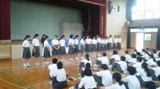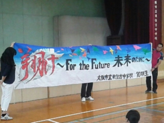 8日(金)の5、6限に修学旅行の取り組みを行いました。5限は体育館でしおりを使いながら、隊形の練習や説明などを行いました。また、横断幕も披露されました。美術部を中心としたメンバーによって、とても立派な横断幕が完成しました。横断幕には、修学旅行のスローガンが描かれています。修学旅行だけでなく、これからの行事に活用していきます。