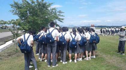 1〜3組はセレモニーした場所に戻りました。モニュメントの説明や掩体壕についての説明を聞きました。