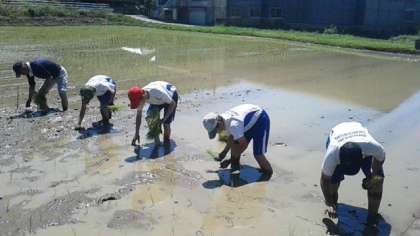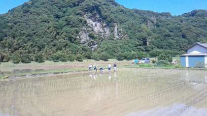 Bコース、午後からの第1弾は、田植えです。1列に並んで、ロープに沿って、丁寧に並べていました。田んぼの中には、おたまじゃくしがたくさん泳いでいました。