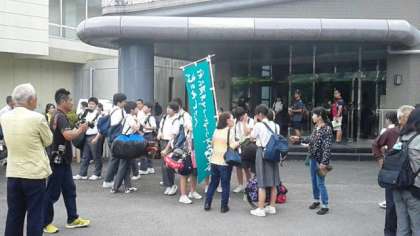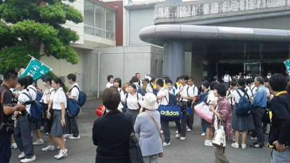 式後、ホールを出て、民家の方に見送られ、バスに乗りました。別れを惜しみ、涙を流す生徒もいました。