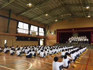 12日(金)の6限に2回目の学年練習を行いました。今回は実際に歌って、体育館での歌声の響き方を確認しました。舞台の上で歌う緊張感や体育館の広さなど、教室や音楽室などでの練習とは違うことを実感し、来週の合唱コンクールに向けて、各クラスの課題が見えてきたようです。