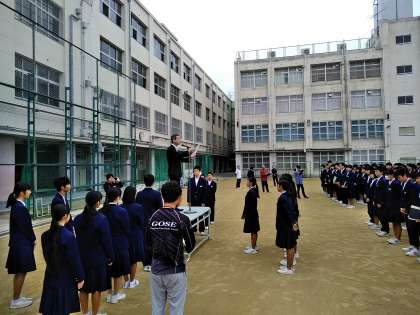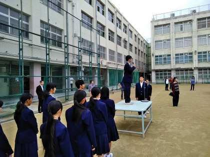 全校集会では、はじめに部活動や学校外における東住吉中学校生徒の活躍を賞しました。