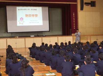 1年生は地域の避難場所に集合してから、防災リーダーの方とともに集団登校をしました。登校後は体育館に集まり、危機管理室の方より防災についてのお話をしていただきました。実際の被災時に利用される簡易トイレや更衣室なども見せていただきました。