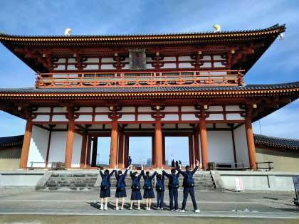奈良は晴天に恵まれて、とても清々しい様子です。予定通りに平城宮跡に到着しました。朱雀門をバックにハイ・チーズ!
