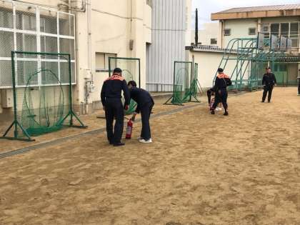 今年は、3分41秒でした。次に、水消火器での消化訓練を行いました。消防署の方に、消火器の使用方法や射程距離などの注意事項を説明していただき、生徒会のメンバーが放水し、「意外と簡単に放水できた。」「思ったより水圧が強かった」などの感想を言ってくれました。
